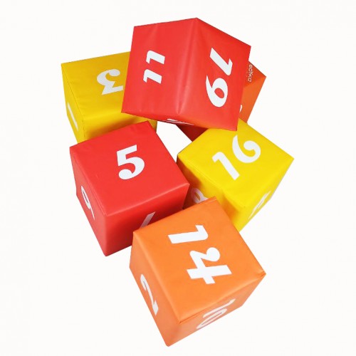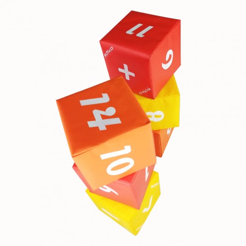 Набор из шести мягких кубиков с цифрами от 1 до 20 и математическими символами "+", "-", ":", "x", "=", ">".