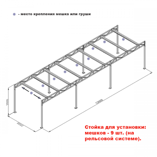 Стойка для боксерских мешков профессиональная №7 (на 9 мешков (на рельсовой системе)) (Ш:Д:В): 3,5:13,0:3,0 м.
